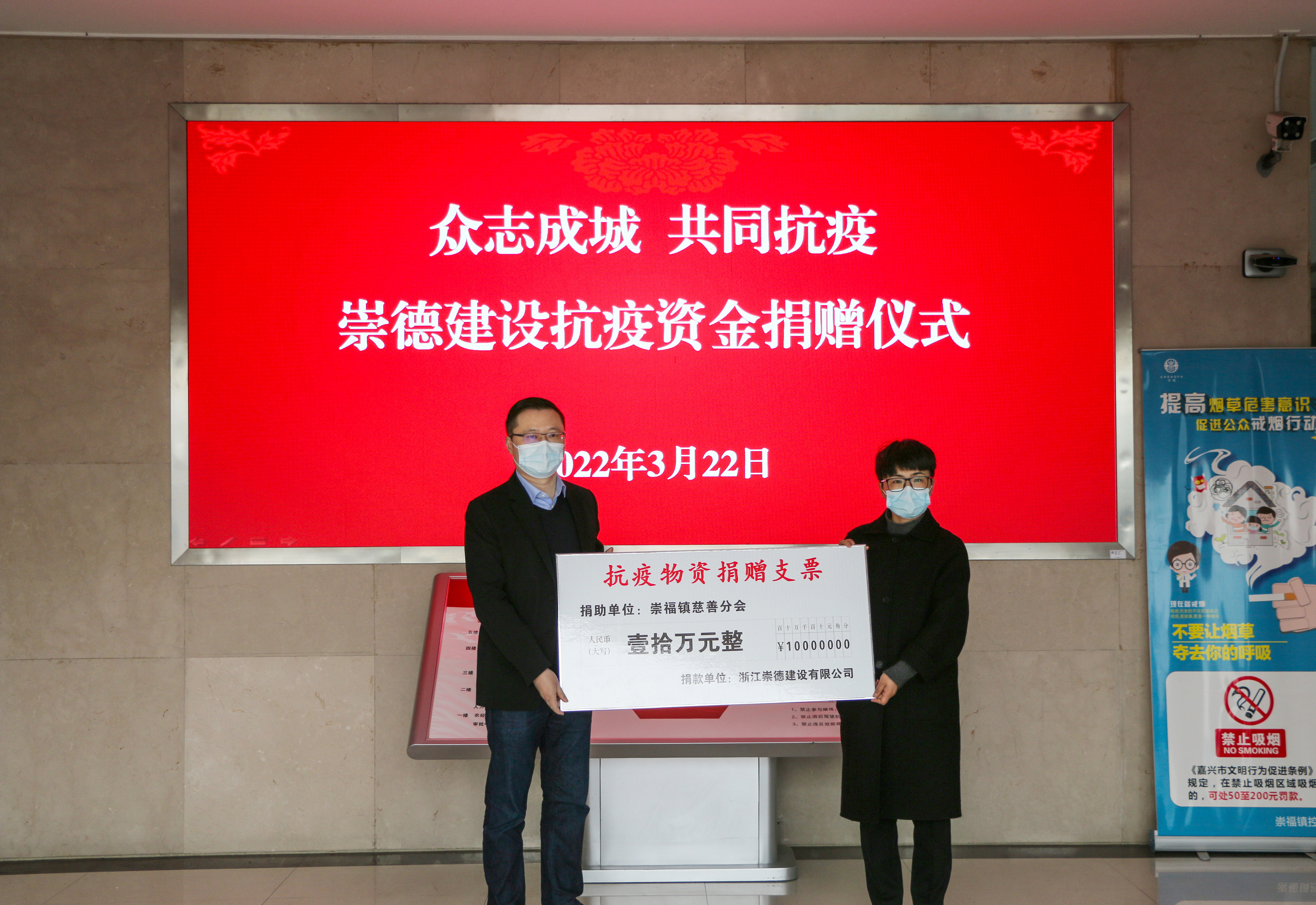 捐贈儀式上,浙江崇德建設(shè)有限公司通過“桐鄉(xiāng)市慈善總會崇德建設(shè)冠名慈善共富基金”向崇福鎮(zhèn)捐款10萬元,定向用于崇福鎮(zhèn)抗疫專用資金,以實(shí)際行動為打好疫情防控殲滅戰(zhàn)貢獻(xiàn)出一份力量!